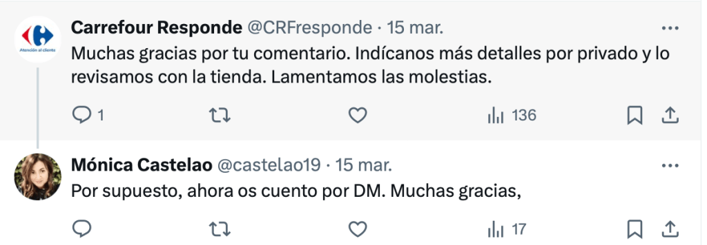 El día que abandoné mi supermercado de referencia sin comprar y para no volver, me quejé a través de mi cuenta personal en X, y el Community Manager de turno, muy amable y asepticamente y siguiendo el protocolo establecido, desvió la conversación a los mensajes privados y me aseguró que revisarían procedimientos internos para que no volviera a ocurrir. Y ahí se quedó el tema.